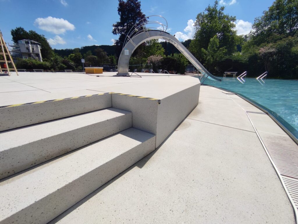 - Schodové prvky – Navržené s důrazem na komfort, bezpečnost a estetickou integraci do celkového konceptu koupaliště. Pískovaný povrch zajišťuje protiskluznost i při zvýšené vlhkosti.